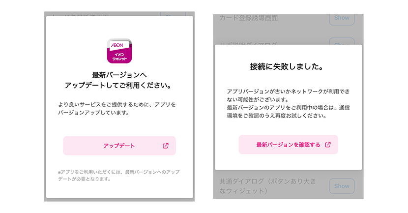 以下の画面が表示された場合は、アプリのアップデートをお願いいたします。