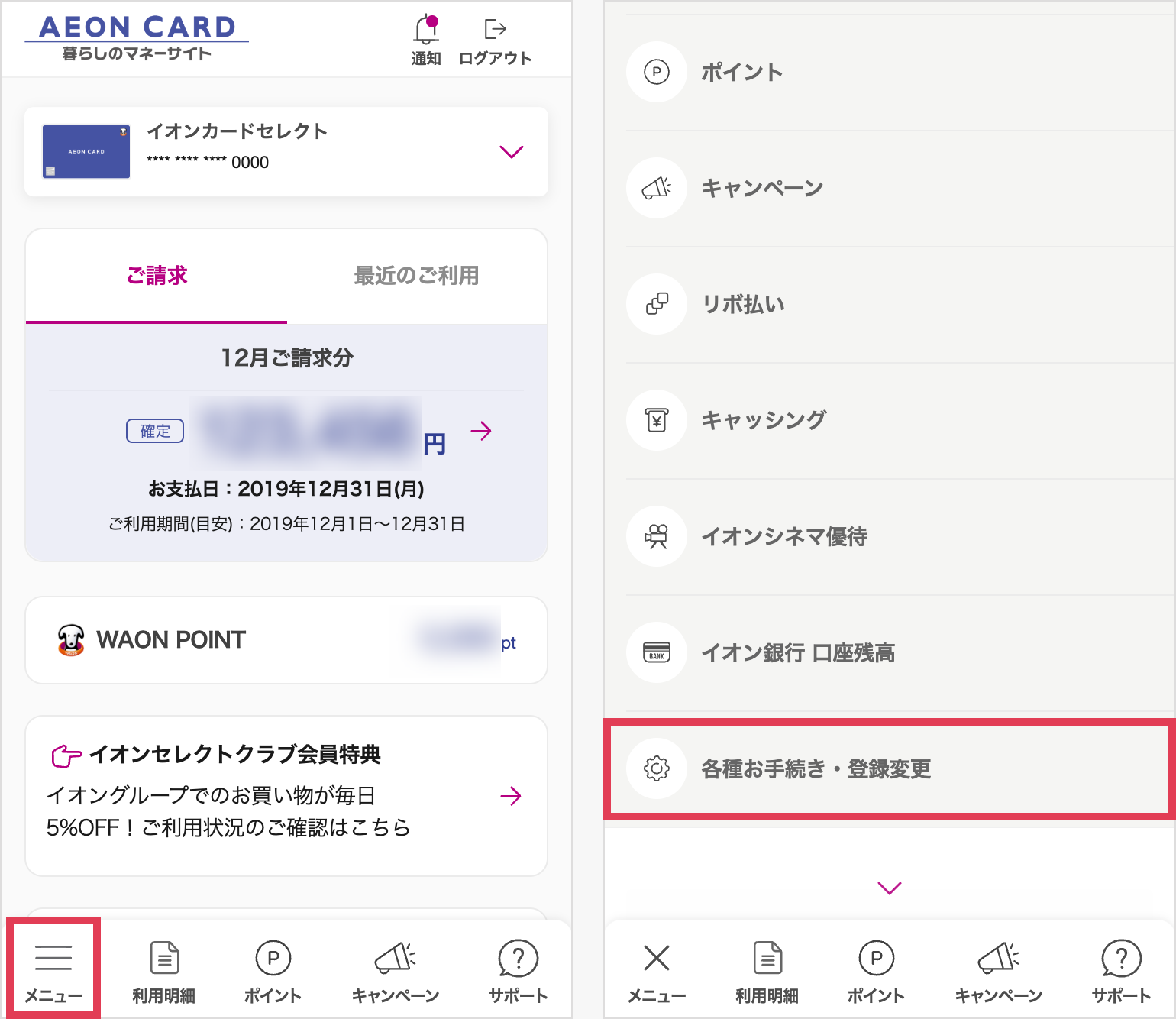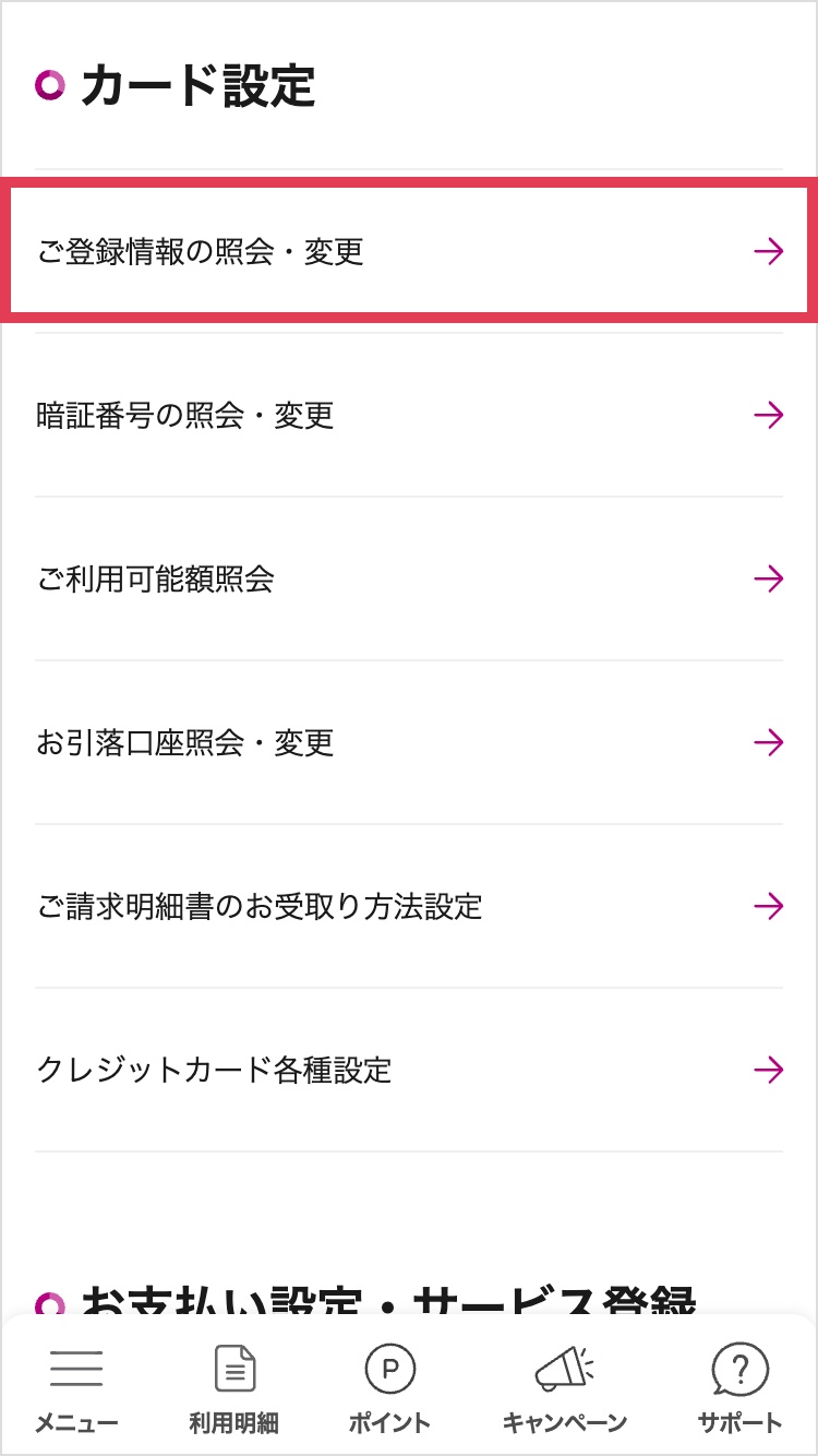 「メニュー」→「各種お手続き・登録変更」を選択してください。