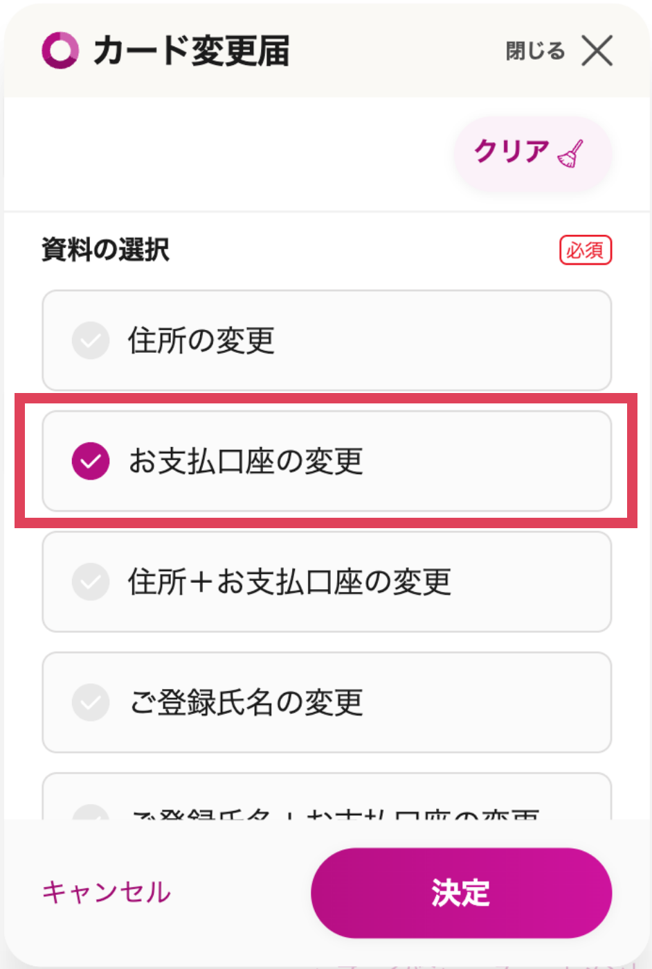 2.「カード変更届」の<希望する>にチェックし、資料の種類から「お支払口座の変更」を選択し、<決定>ボタンを選択