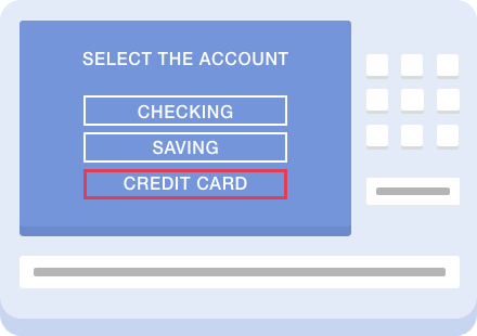 「SELECT THE ACCOUNT」の画面では、クレジットアカウントを選択します。クレジットカードでキャッシングする場合は「CREDIT CARD(クレジットカード)」を選択します。